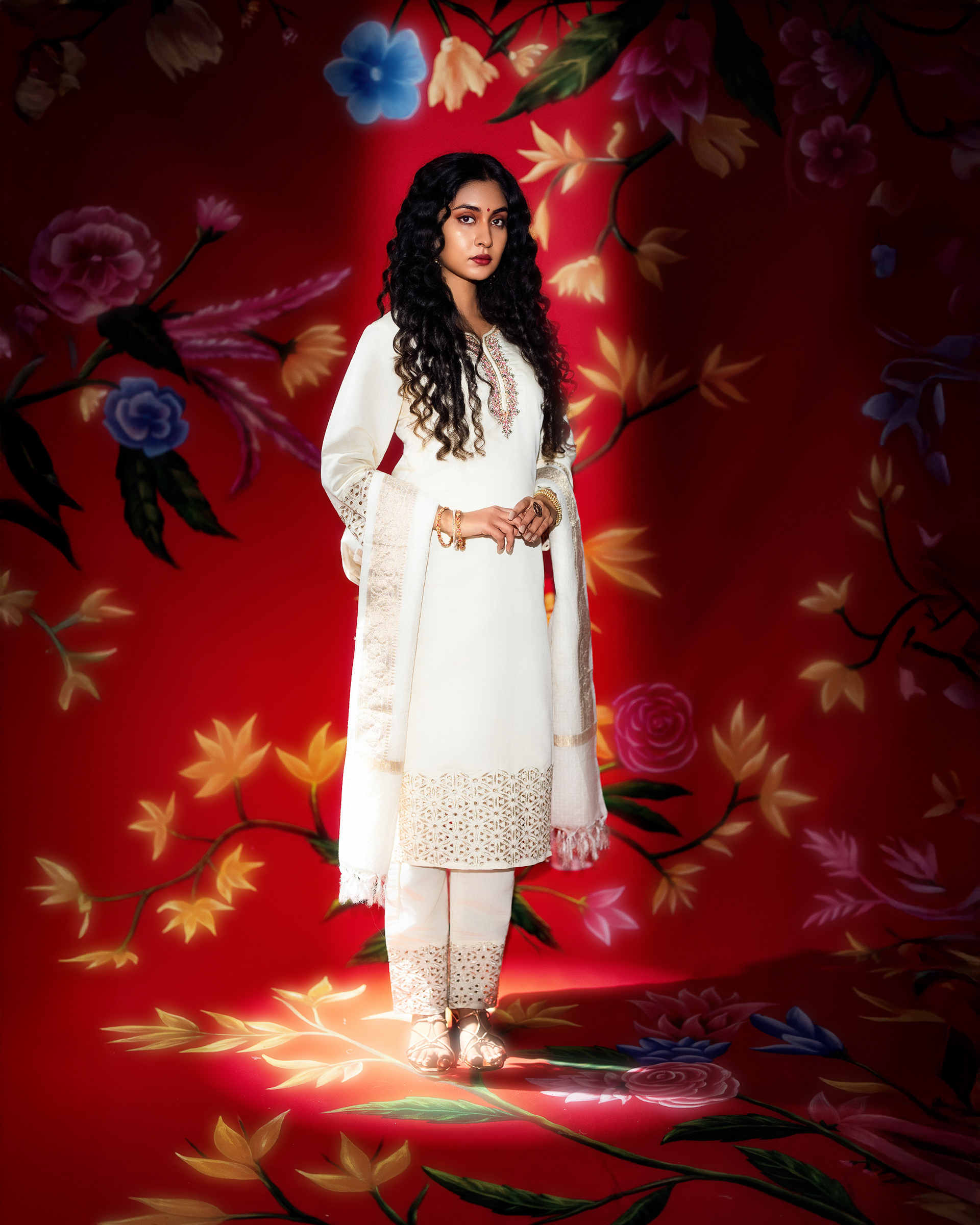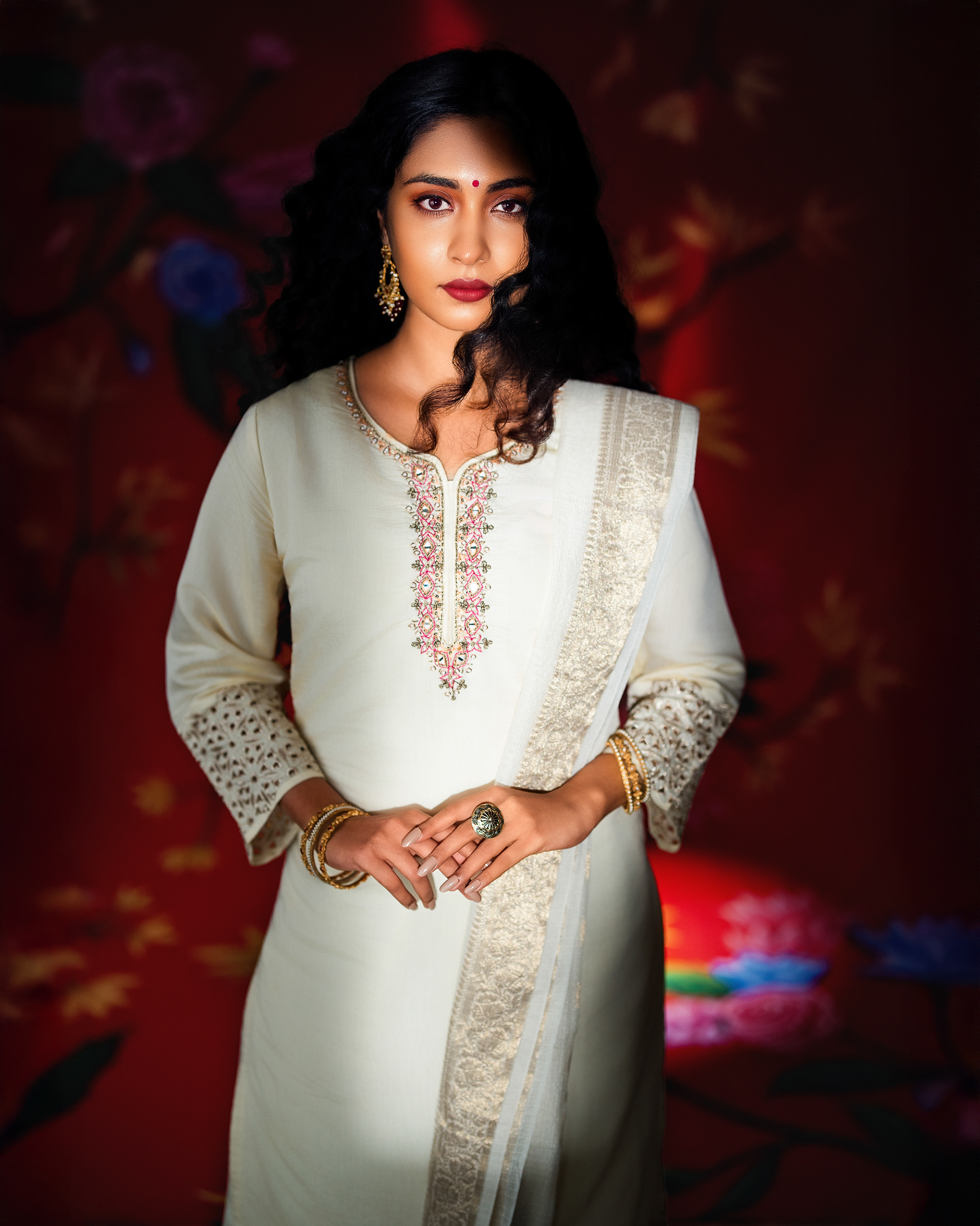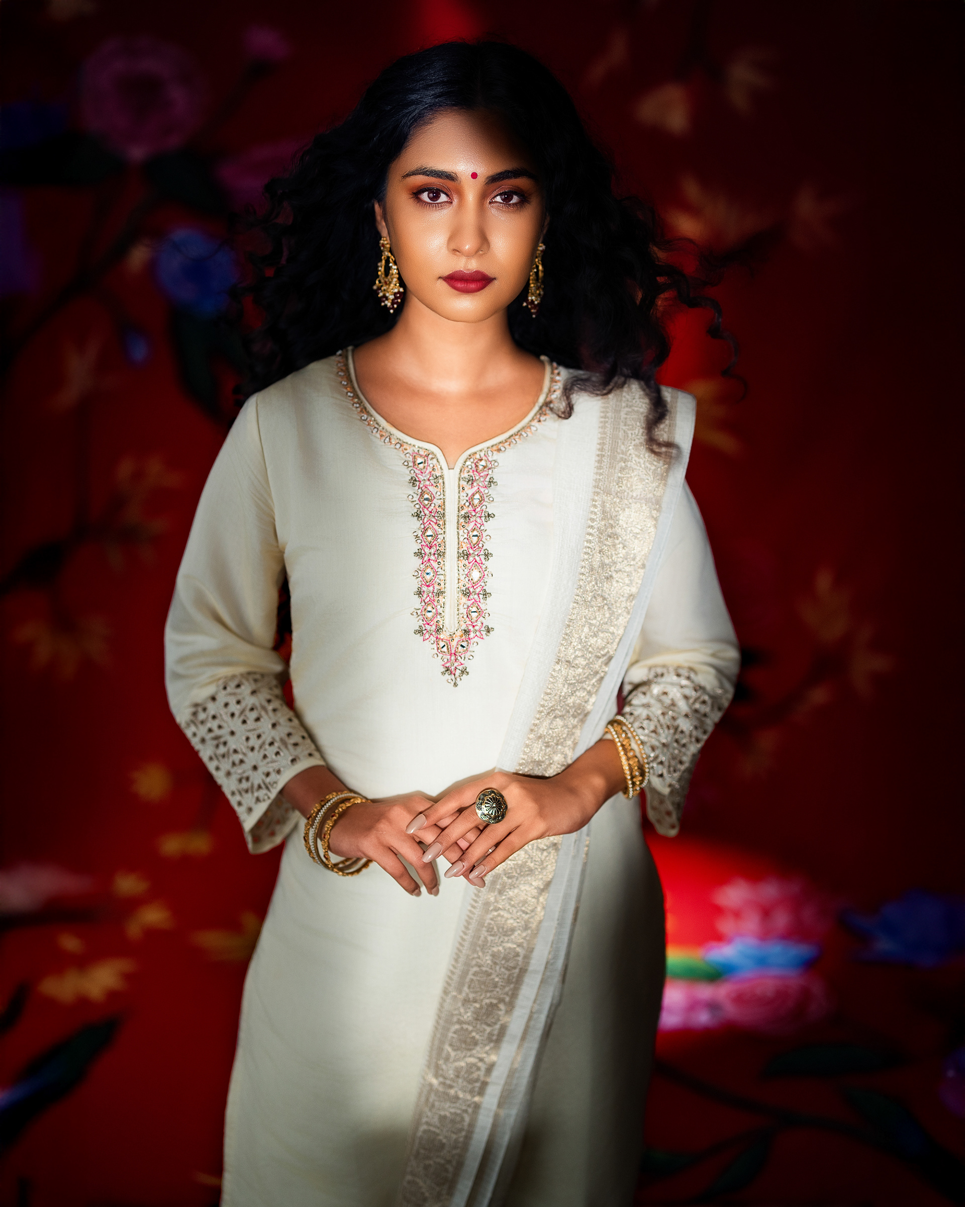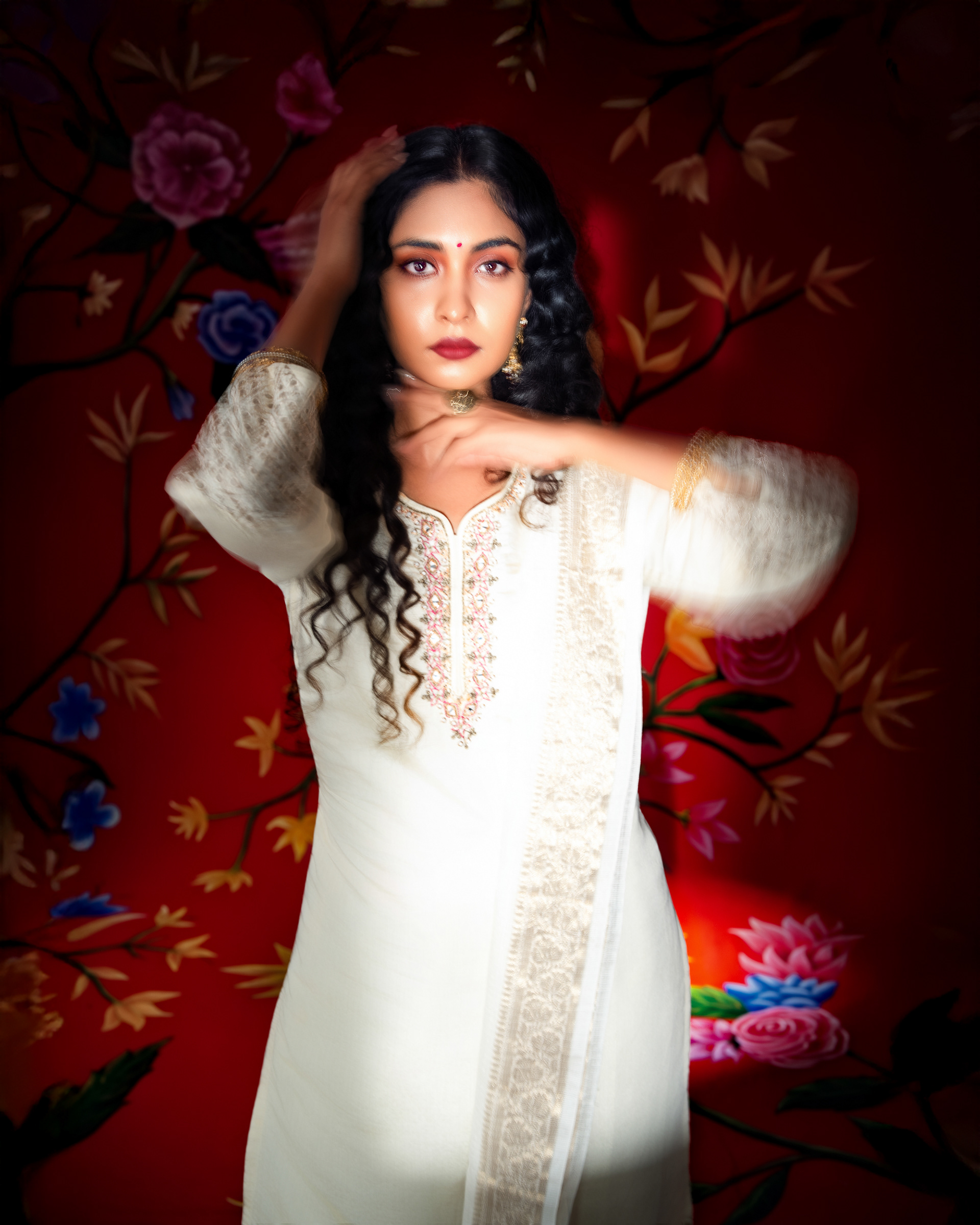 This project celebrates timeless femininity through a refined blend of tradition, craft, and visual storytelling. Set against a rich red backdrop layered with floral motifs, the imagery draws from classic Indian aesthetics while presenting them through a contemporary editorial lens.