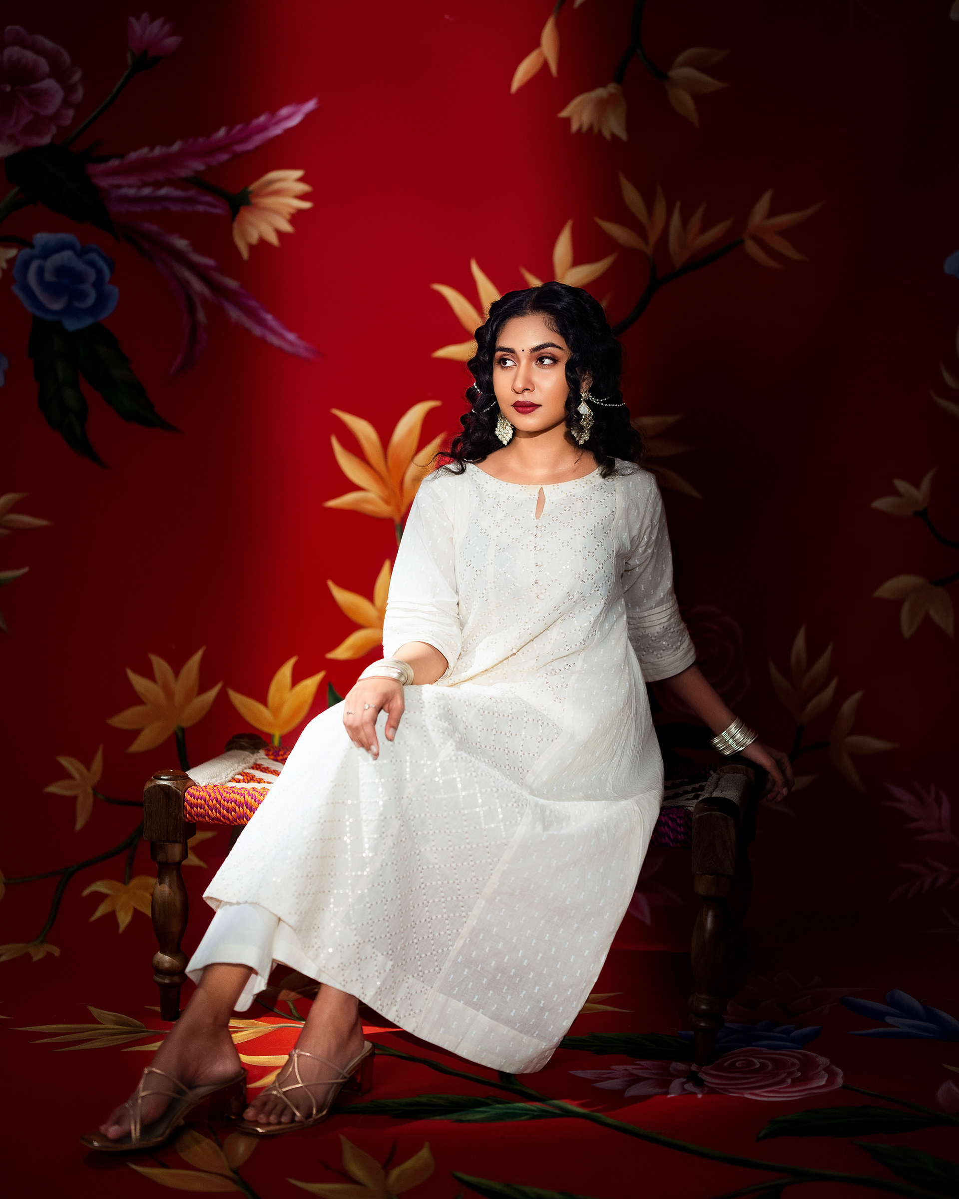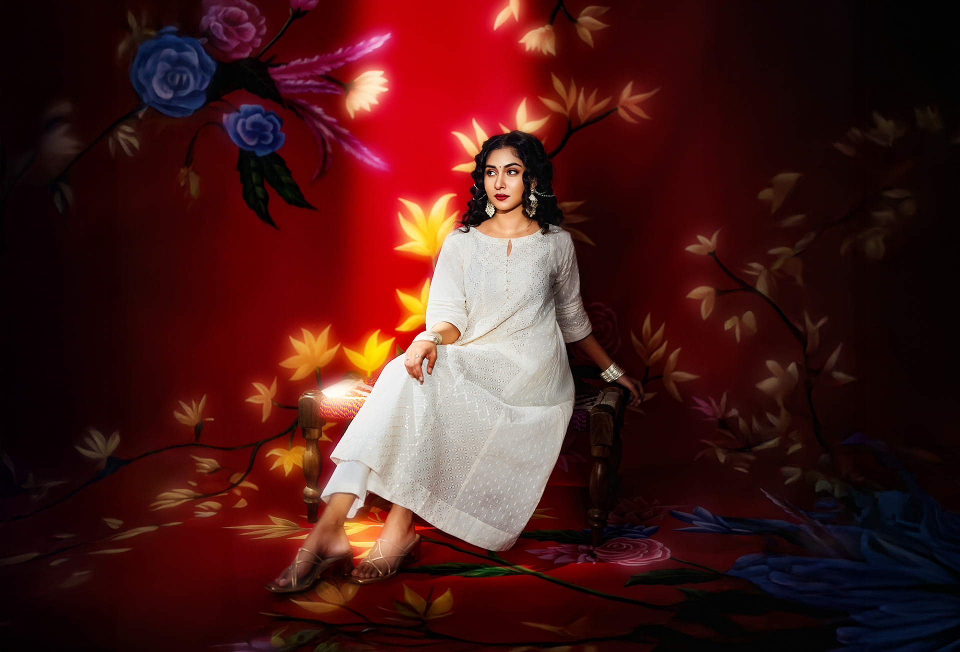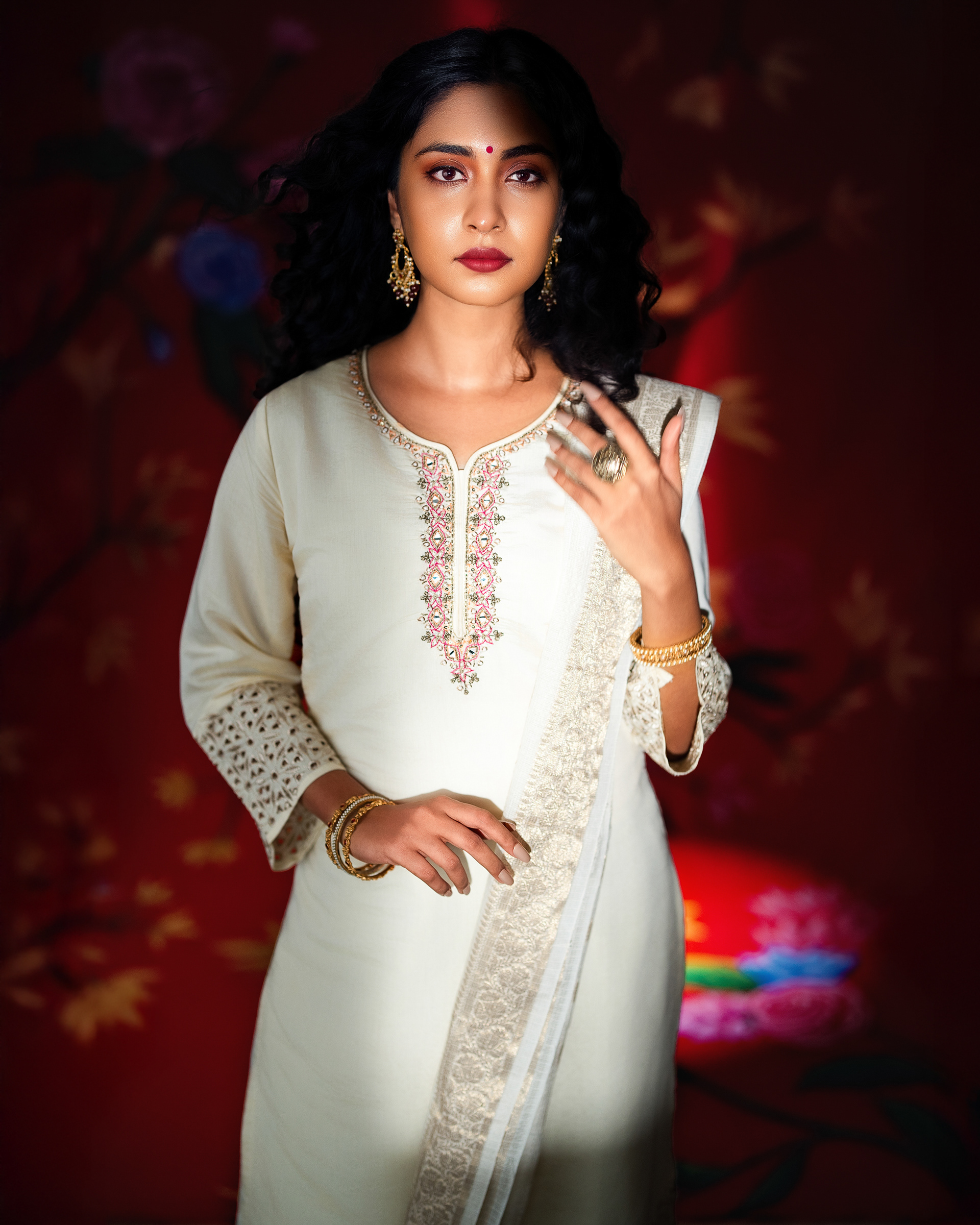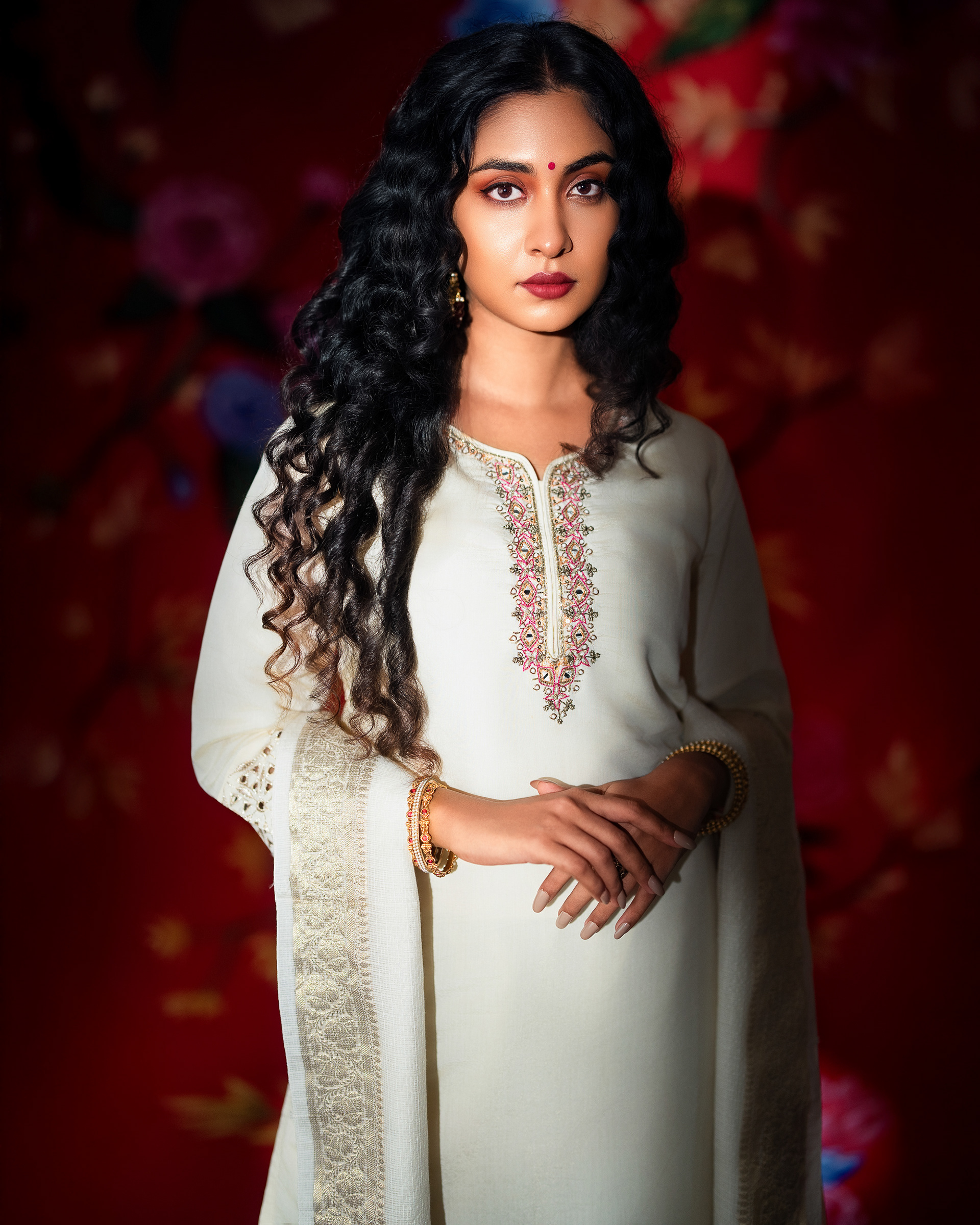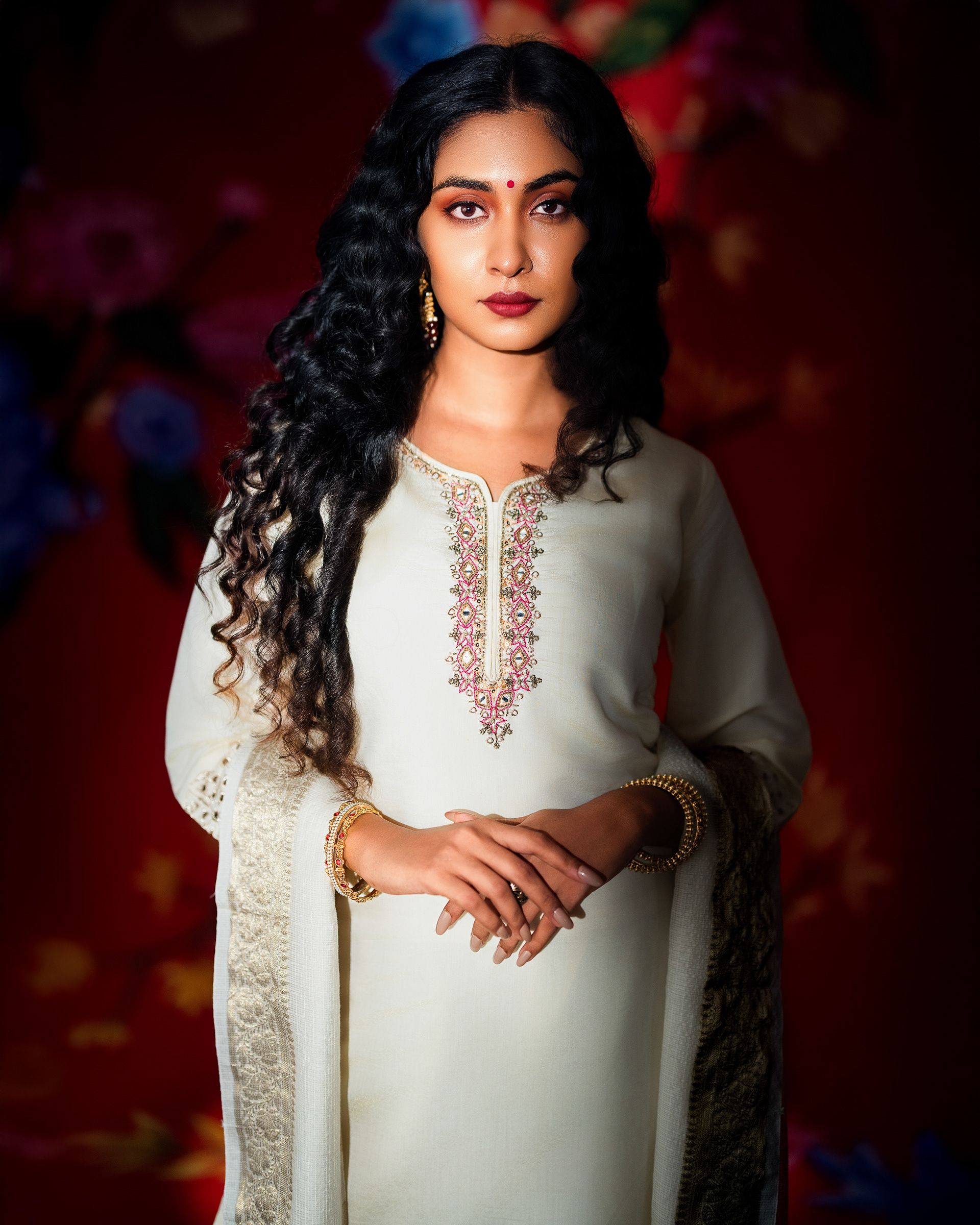 This project celebrates timeless femininity through a refined blend of tradition, craft, and visual storytelling. Set against a rich red backdrop layered with floral motifs, the imagery draws from classic Indian aesthetics while presenting them through a contemporary editorial lens.