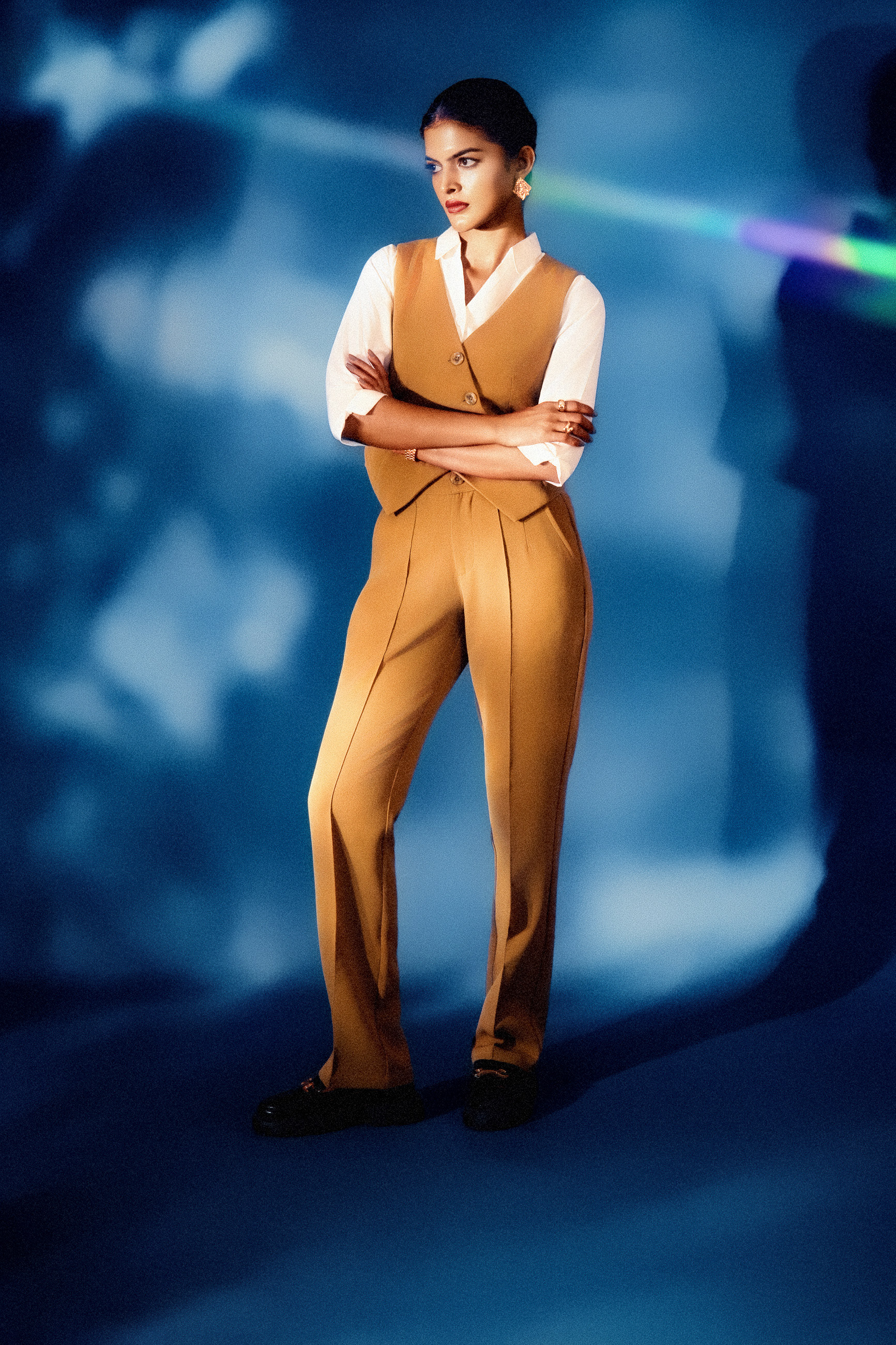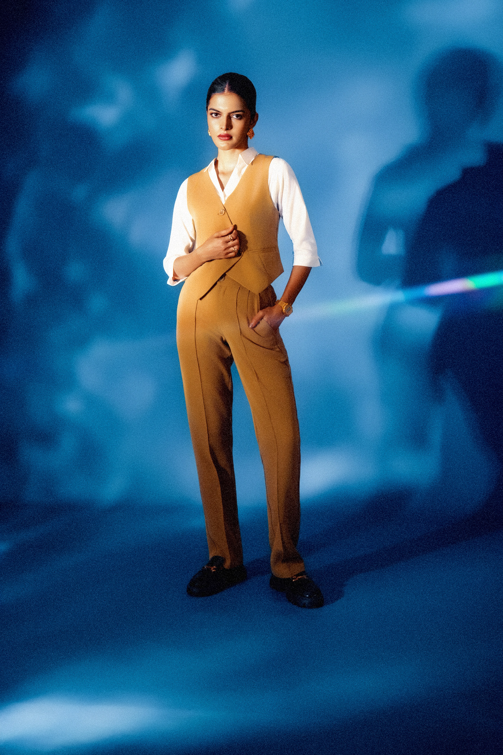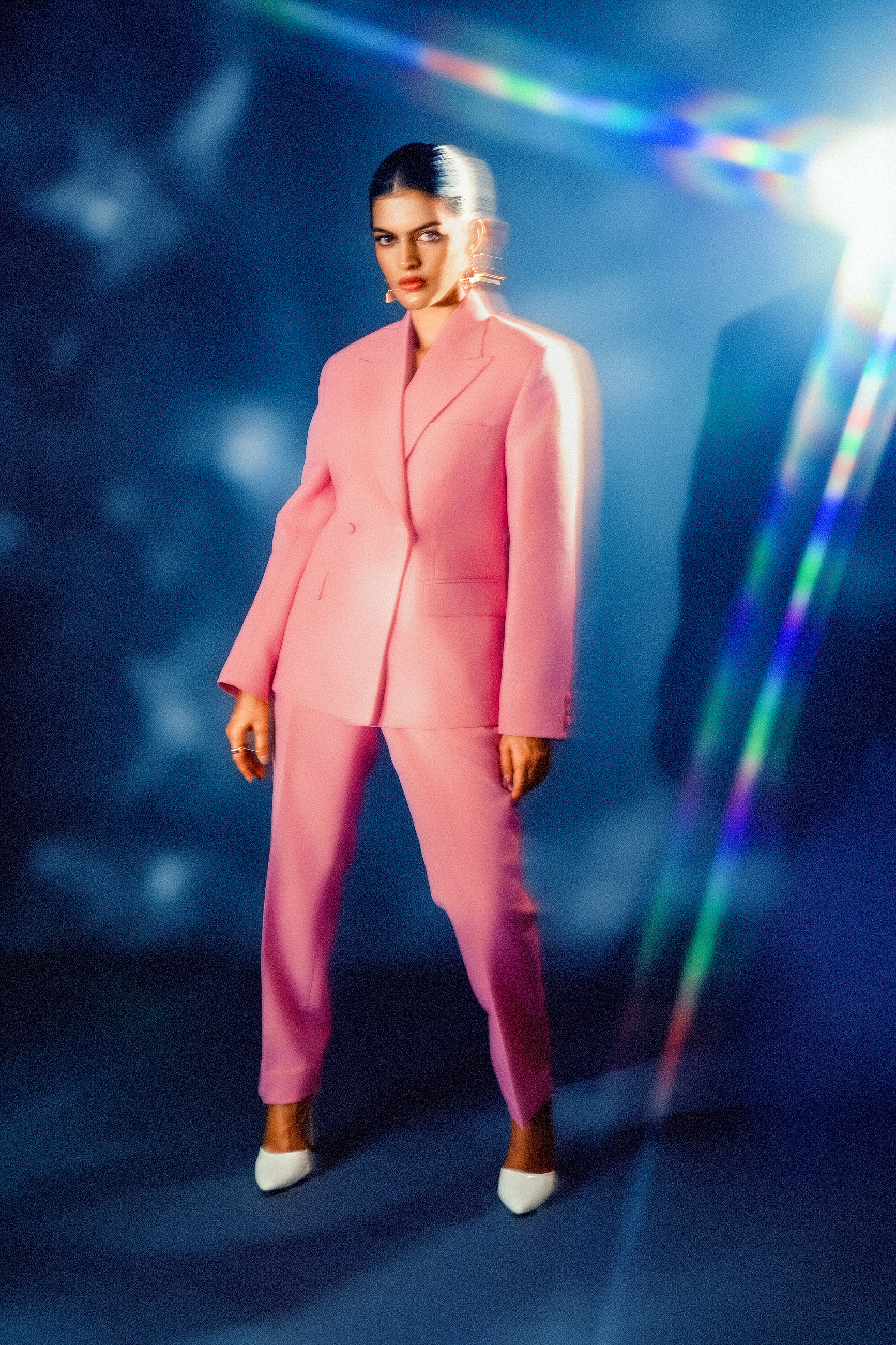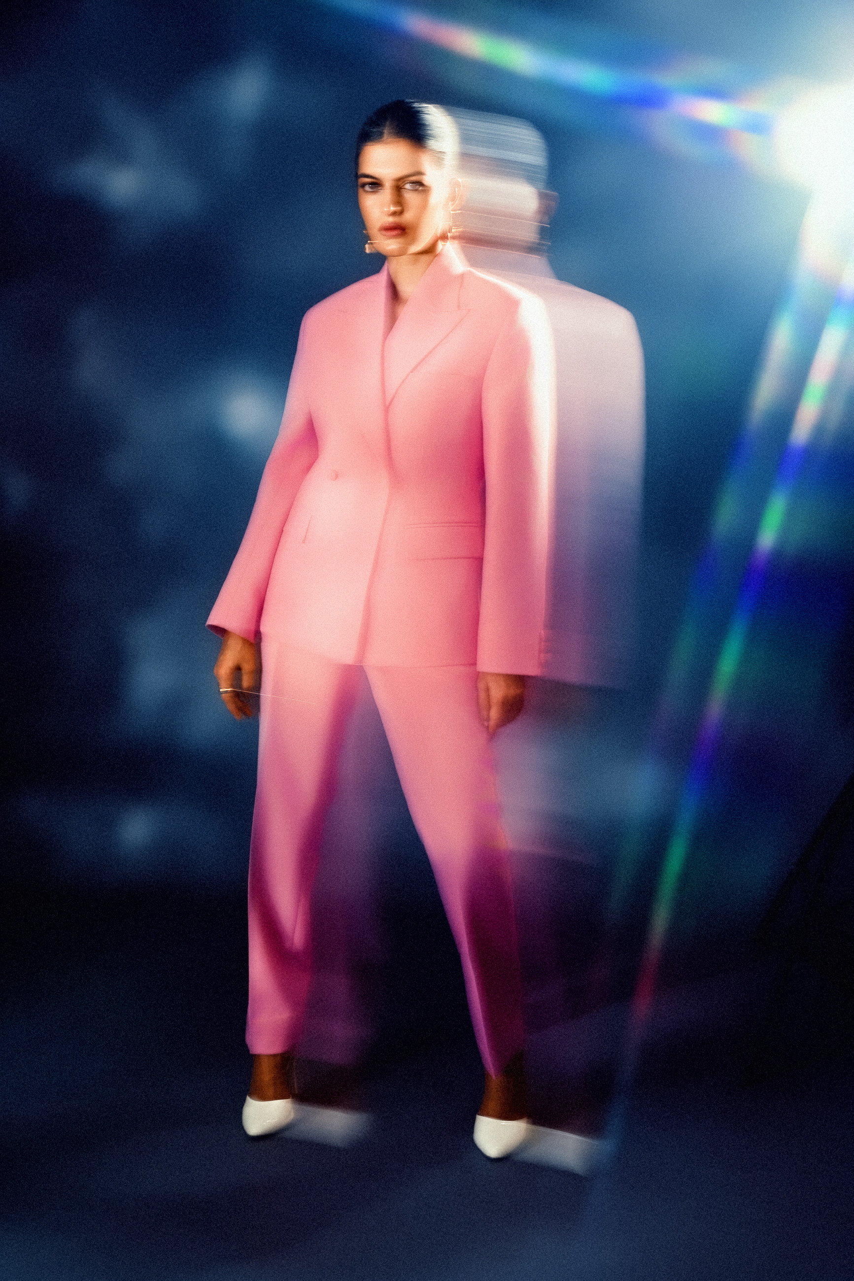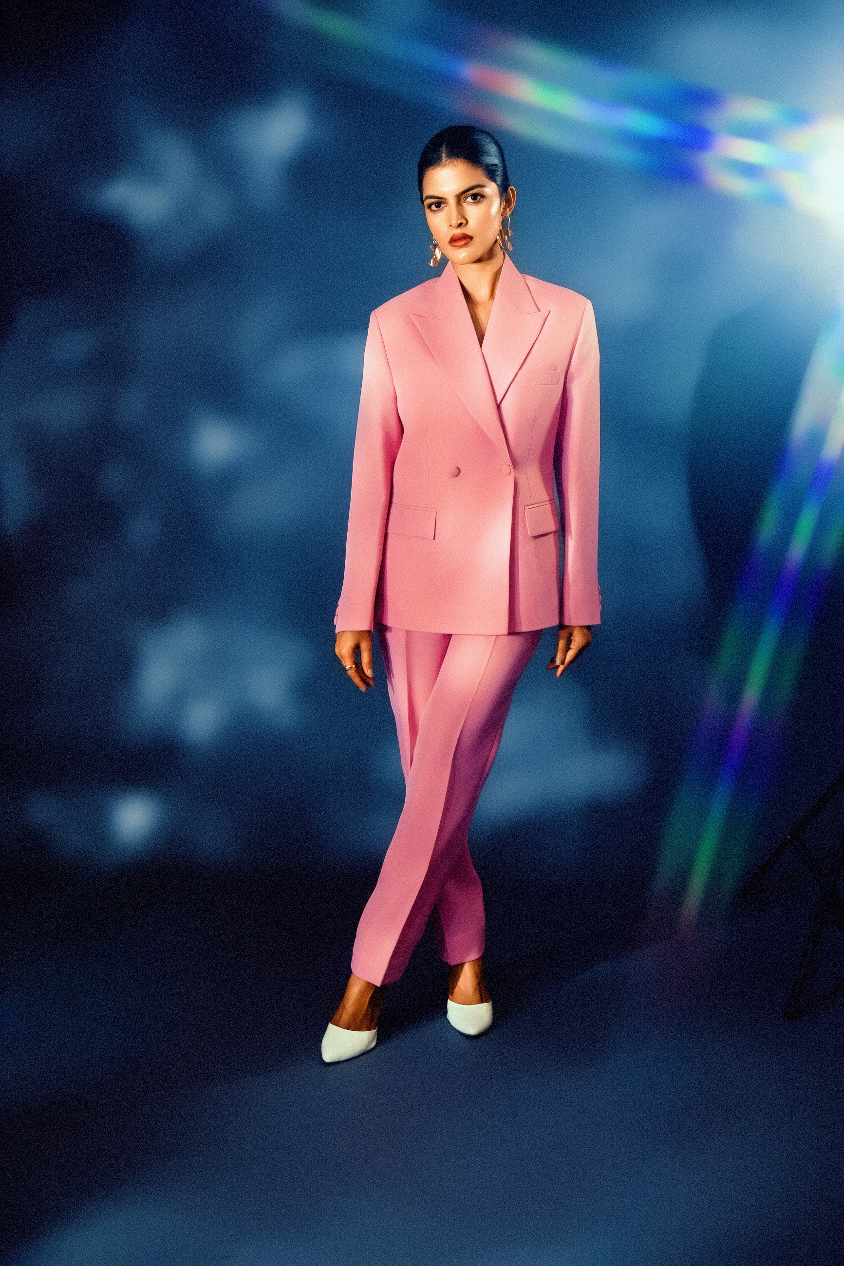 This series explores modern power dressing through a blend of bold silhouettes and soft cinematic lighting. The visual concept focuses on creating an elevated, fashion-forward mood where structure meets elegance. The first look features a warm neutral palette, styled with minimal yet confident tailoring, captured against a dreamy textured backdrop that enhances the refined tonality of the outfit. The second look introduces a striking pink suit, paired with motion-inspired lighting effects to create a sense of energy and duality. The prism flares and subtle blur give the frame a surreal, contemporary edge while maintaining the sophistication of the garment.